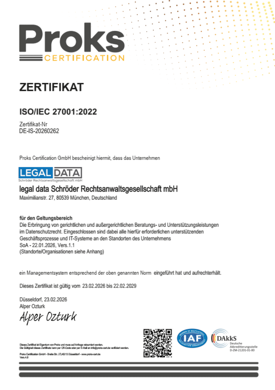 Die ISO 27001-Zertifizierung ist nicht nur ein Stück Papier – sie ist ein klares Signal an alle Mandanten und Partner der legal data Schröder Rechtsanwaltsgesellschaft mbH. Sie zeigt, dass die Kanzlei den Schutz sensibler Informationen sehr ernst nimmt. In einer Zeit, in der Datenschutzverletzungen fast täglich Schlagzeilen machen, ist es beruhigend zu wissen, dass Ihre persönlichen und geschäftlichen Daten bei der legal data Schröder Rechtsanwaltsgesellschaft mbH in sicheren Händen sind. Vertrauen ist die Basis jeder Geschäftsbeziehung, und mit dieser Zertifizierung setzt die legal data Schröder Rechtsanwaltsgesellschaft mbH ein starkes Zeichen.